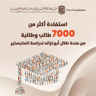 عمان - ارتفع عدد الطلاب المسجلين في المنحة الكاملة لدراسة الماجستير التي قدمها سعادة الدكتور طلال أبوغزاله، رئيس ومؤسس مجموعة طلال أبوغزاله العالمية، للاجئين الفلسطينيين والنازحين العرب إلى أكثر من 7000 طالب وطالبة وذلك بعد تسجيل 645 طالبًا وطالبة خلال الفترة الأخيرة.