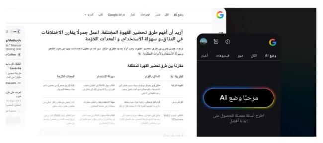 بفضل قدرات الاستدلال والتفكير في نموذج Gemini 2.5، والذي يدعم "وضع AI"، يمكنك الاستفسار عن أصعب الأسئلة، والتعمق في البحث عبر أسئلة متابعة. ومثال على ذلك: "أريد أن أفهم طرق تحضير القهوة المختلفة. اعمل جدولًا يقارن الاختلافات في المذاق، وسهولة الاستخدام، والمعدات اللازمة."